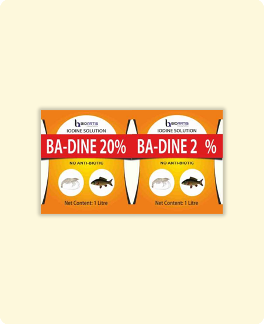 Ba - DINE 20% and 2%is a widely used chemical disinfectant in aquaculture. Which can decrease the occurrence of diseases and improve the survival. In aquaculture water with105 CFU/ml bacteria, 20 ppm of Ba-Dine could kill 99% and 100% of the bacteria.